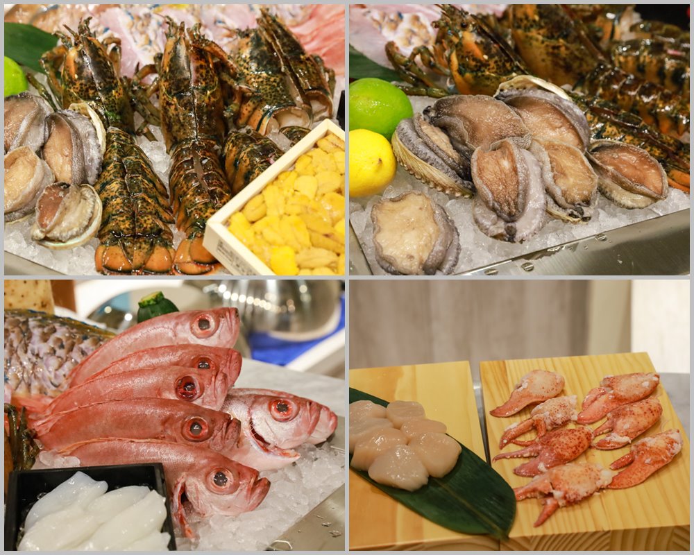 當天要料理的食材都會準備好,擺放在桌邊的料理台上,有新鮮活龍蝦、日本A5和牛、國宴頂級桂丁雞、北海道生食級干貝、日本赤海膽…等,大家看到都要流口水了,這些頂級食材也太澎湃了〜